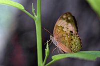 Deze foto toont een vlinder die delicaat rust op een groen blad in de rustgevende natuurlijke omgeving van de Bogor Botanical Gardens in Indonesië. De vleugels van het insect zijn gedeeltelijk uitgespreid in oranje tinten, onderbroken door bruine en zwarte patronen, met een subtiel vleugje groen aan de bovenkant. Het contrast tussen de felle kleuren van de vleugels en de zachtheid van het omringende groen springt onmiddellijk in het oog en trekt alle aandacht. De precieze focus onthult de details van zijn ogen, antennes en slanke poten die zich vastklampen aan het blad, terwijl de onscherpe achtergrond zijn fragiele, sierlijke silhouet verder benadrukt. Als symbool van lichtheid en metamorfose belichaamt deze vlinder alle vergankelijke schoonheid van de tropische natuur. Dit beeld illustreert niet alleen de rijkdom van de biodiversiteit van Indonesië, maar ook het belang van eenvoudige momenten waarop we de poëzie van wilde dieren in al hun pracht kunnen aanschouwen.