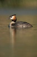 Over "De fuut (Podiceps cristatus) zwemt in kalm water, glimmend metaaloppervlak, wild, Europa."