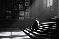 De zwart-witfoto toont een man met een hoed en jas die alleen op de trappen van een groot, bijna leeg gebouw zit. Invallende lichtstralen breken door hoge ramen en werpen lange schaduwen op de vloer. Achter hem hangen talloze ingelijste foto's aan de muur, als stille getuigen. De setting lijkt tijdloos, als uit de jaren dertig, en doet…
