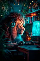 In een mysterieuze kamer met zacht licht en ritselende bladeren zit een majestueuze leeuw achter zijn computer. Getooid met een koptelefoon en gefocust op het scherm ontvouwt zich een spel dat zijn dierlijke intuïtie uitdaagt. Het contrast tussen de majestueuze natuur en de digitale wereld roept een fascinerend beeld op van de moderne wildernis.