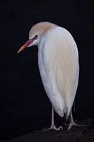 De gebeitelde Egyptische reiger witte bevallige vogel staat met de neus naar beneden op een zwarte achtergrond