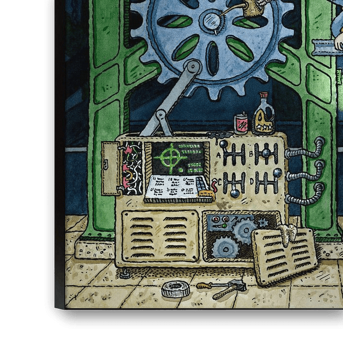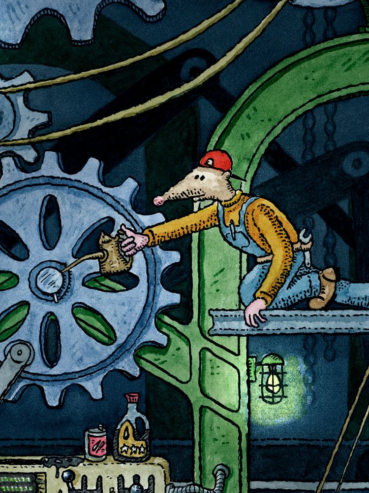 De machinist vertroetelt zijn machine. Een beetje olie hier, daar even een schroefje aandraaien, aan het geluid kan hij horen of de boel weer gesmeerd loopt. Tjoemp-tjoemp, bopbopbopbopbop, pshhhhhhhh… De grote machine pruttelt tevreden terwijl de grote tandwielen draaien. Maar wat doet de machine eigenlijk?