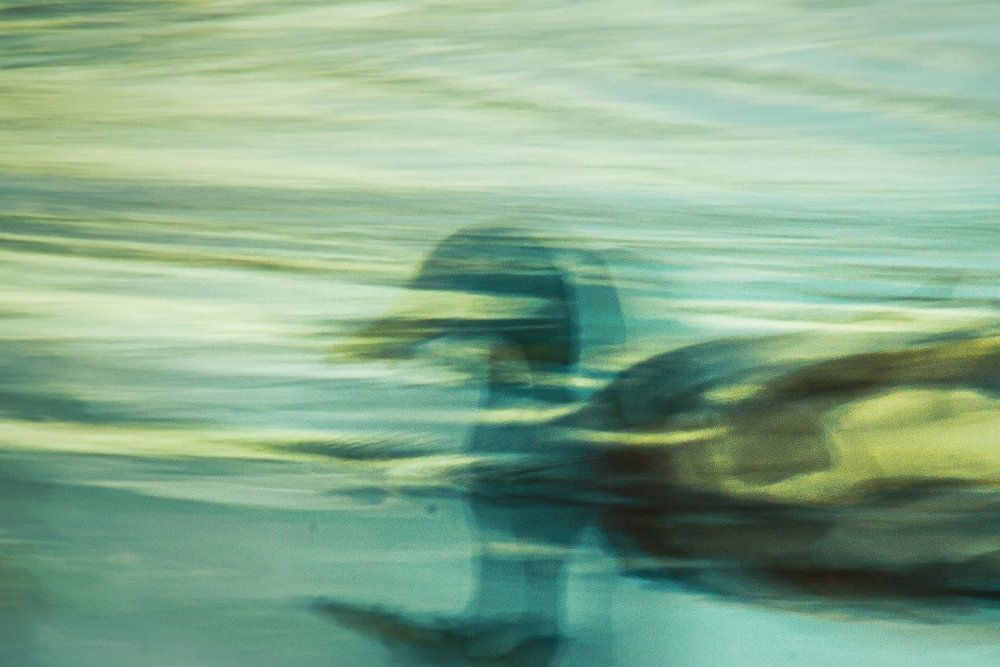 Een eend glijdend over het water, maar vervaagt door de lijnen van het licht. Waardoor het een geest lijkt die voorbij zwemt, opweg naar zijn laatste thuishaven.