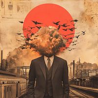 Een man in een elegant pak staat met zijn rug naar de camera terwijl een enorme rode cirkel van zonlicht boven zijn hoofd zweeft. In plaats van een gezicht ontvouwt zich een wolk van rook en vogels die opstijgt naar de hemel. Deze fascinerende scène combineert elegantie en chaos en symboliseert innerlijke conflicten en vluchtige…