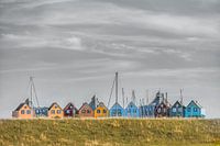 De haven van het Friese IJsselmeerstadje Stavoren heeft als een van haar kenmerken een serie sterk gekleurde huizen langs de rand van de oude haven. Hier net boven de noorderdijk uit stekend.