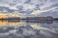 Avondfotografie van de gekleurde huizen aan de Rietplas te Houten, waarbij de wolken gespiegeld in het water reflecteren.