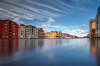 De gekleurde pakhuizen van Trondheim aan de rivier Nidelva. Ze staan op houten palen in het water en zijn nu vaak verbouwd tot woning of bedrijfspand.