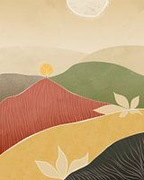 Minimalistische illustratie van een landschap met velden, verre heuvels en een enkele gele boom onder de zon. De kleuren – vervaagde tinten van beige, geel, groen, rood, grijs en natuurwit – staan voor de warme waas van een middag in de nazomer. Het kunstwerk kan een kalm en vredig element toevoegen aan elke kamer.