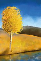 Digitaal acrylschilderij van een landschap met een boom in geel bij een rivier onder een stralend blauwe hemel. Het landschap is geschilderd in een losse stijl en benadrukt de mooie contrast tussen blauw en geel.