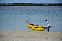 Toen het cruiseschip aankwam op Grand Bahama Island op de Bahama's huurden we een auto voor de paar uur die we op het eiland konden doorbrengen. Het gaf ons veel meer flexibiliteit dan de standaard excursies. Onze eerste stop voor wat koffie was in Paradise Cove. Het is een plek waar je kajaks kunt huren en we waren helemaal weg van de gele kajaks die deze man aan land sleepte.