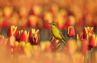 De gele kwikstaart in avondlicht zit boven op een tulp in een Nederlands tulpenveld.