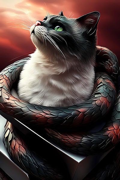 "The Serpent's Grace: The Familiar Oracle is een adembenemende fusie van mystiek, spanning en elegantie - een kunstwerk dat de dubbele essentie van gevaar en wijsheid vangt door een onwaarschijnlijk verbond. Dit rijk gedetailleerde werk toont een rustige kat genesteld in de kronkels van een levende, geschubde slang onder een…