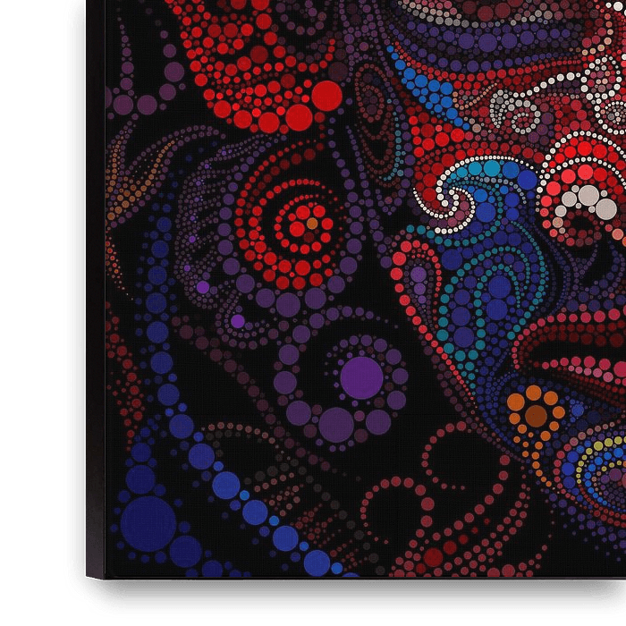 In "The Geometry of Spirit" herinterpreteert Adi Indra Cahyadi (adiegodel) het begrip spiritualiteit en universeel bewustzijn door middel van een synthese van digitaal pointillisme, geometrische abstractie en kosmische kleursymboliek.