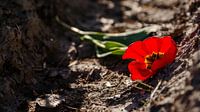 Verloren in het bandenspoor van een landbouwtrekker lag deze tulp. Het licht aan het einde van de dag gaf een prachtig strijklicht over het tulpenveld. Het leek of deze uit de gratie gevallen tulp nog een laatste keer probeerde te stralen. Verloren in dat gangpad kwam zijn intense rode kleur nog een keer tot leven.