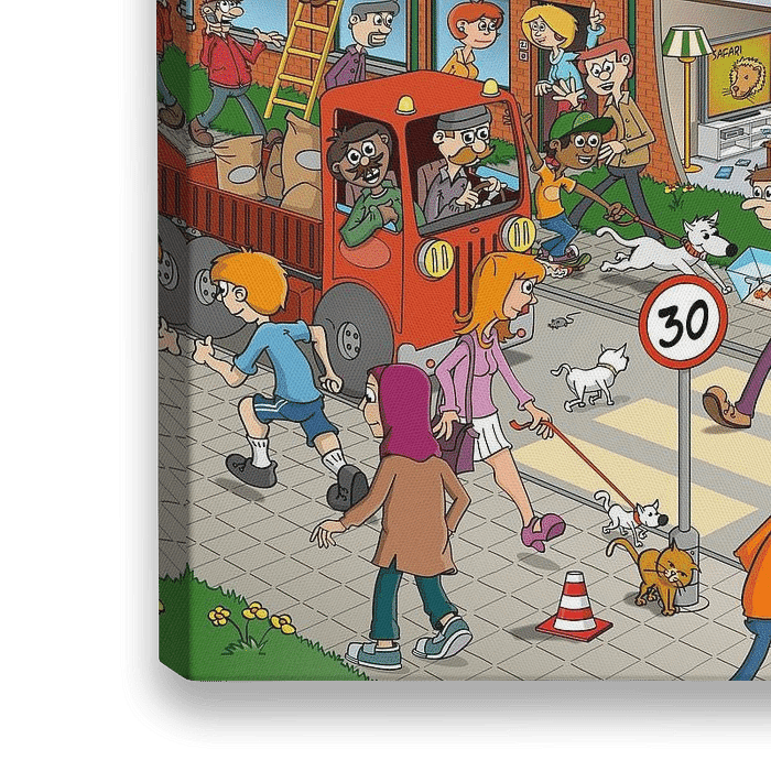Deze kleurrijke, speelse tekening zit vol herkenbare situaties en kleine grapjes die je steeds opnieuw laten glimlachen. Perfect voor iedereen die houdt van humor, detail en het alledaagse leven met een knipoog.