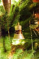 Kerstversiering in de vorm van een bel die schittert in de verlichte kerstboom.