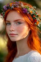 Een stralende teint en levendig, glanzend rood haar harmoniëren perfect met de delicate bloemenkrans die het gezicht van de jonge vrouw streelt. Haar fijne sproeten vertellen verhalen van zorgeloze dagen. Dit betoverende portret voegt een vleugje frisheid en lichtheid toe aan elke woonkamer, ideaal om een uitnodigende sfeer te creëren.
