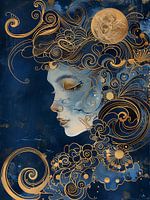 Een mystiek silhouet rijst op uit de duisternis van de nacht, haar contouren versmelten met sierlijke gouden versieringen. Haar gesloten ogen getuigen van dromen die verder reiken dan ruimte en tijd. De maan waakt over haar terwijl haar gedachten oplossen in gebogen lijnen - een belichaming van elegantie en kosmische melancholie.