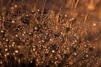 De "gouden" paardenbloem met druppels is een macrofoto van een paardenbloem.  Door de belichting en omgevingskleuren kleuren  de pluisjes in een goud achtige kleur.