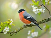 Een goudvink met zijn prachtig gekleurde verenkleed zit tussen tere bloemen. Zacht licht en de lichtgroene, onscherpe achtergrond laten de mooie vogel goed tot zijn recht komen.