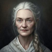 Gnade des Alters fängt ein Porträt von stiller Stärke und zeitloser Würde ein, dargestellt in sanften, naturalistischen Tönen, die sowohl Realismus als auch Ehrfurcht hervorrufen. Das Bild zeigt eine ältere Frau mit zarten, aber entschlossenen Gesichtszügen, deren silberweißes Haar ordentlich zu einem langen Zopf geflochten ist, der über ihrer Schulter liegt. Ihr Gesicht, das von sanftem, diffusem Licht beleuchtet wird, trägt die subtilen Spuren des Alters – feine Falten um die Augen, schwache Sommersprossen auf den Wangen und ein paar zarte Narben, die von einem erfüllten Leben zeugen. Ihre hellblauen Augen, lebhaft und durchdringend, scheinen einen Ozean an Weisheit, Mitgefühl und unausgesprochenen Erinnerungen zu enthalten. Sie blicken ruhig und beständig nach vorne und laden eher zum Nachdenken ein, als dass sie Aufmerksamkeit verlangen.