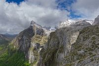 De foto toont een majestueuze, ruige bergtop in het gebergte **Picos de Europa**.