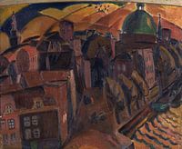 Stadsgezicht van de hoofdstad van Nederland in Holland met woningen en een koepel van de genoemde kerk.