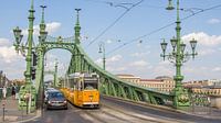 Een afbeelding van een voor Boedapest typerende gele tram op de Vrijheidsbrug over de Donau in Hongarije.