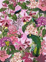 Een groene kaketoe en veel kolibries te midden van bloeiende exotische planten uit historische illustraties, herschikt in vintage stijl.