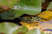 De Groen kikker zit rustig op zijn blad. Half in het water en half boven water. Hij lijkt zijn tijd te nemen en voelt zich volledig op zijn gemak. Groene kikkers zijn een geslacht van kikkers uit de familie echte kikkers. De groep werd voor het eerst wetenschappelijk beschreven door Leopold Fitzinger