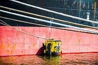 De scheepsromp ligt stil in het water, dof van zout en tijd. Dikke, zware trossen spannen zich van de bolders aan de kade naar het staal van het schip. Ze druipen nog na van het water, stug en verweerd. De zon schijnt fel, werpt harde schaduwen over het dek en laat de roestplekken op de romp oplichten als littekens. Rode, oranje, en bruine vegen tekenen het staal waar de verf is afgebladderd. Alles ademt werk: het geluid van een haven op rust, maar nooit stil.