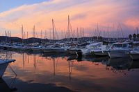 De idyllische jachthaven van Cavalaire-sur-Mer, in het departement Var aan de Franse Rivièra. Een mooie wolkenlucht, gecombineerd met de fraaie kleuren van de zonsondergang, zorgt voor dit plaatje.