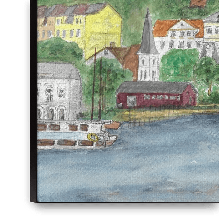 Deze aquarel toont de oostelijke oever van Flensburg met de St. Jürgenkerk op de achtergrond. Het herkenningspunt van Flensburg, het stoomschip Alexandra, vaart rustig met rugwind over de kleine golfjes in het havenwater.