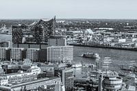 Zwart-wit fotografie excursiestoomboot Louisiana Star op de Elbe, de Elbphilharmonie en de haven van Hamburg in Hamburg, Duitsland