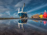De haven van Harlingen, Friesland, Nederland, met aan de kade de neus van een vrachtschip weerspiegeld in een stilstaande plas water.
