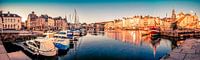 Panorama van de haven van de normandische kustplaats Honfleur in de vroege ochtend onder een blauwe hemel