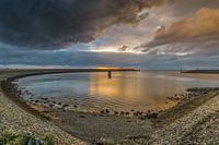 De kom van de havenentree van de Friese havenstad Harlingen met een fraaie wolkenpartij tijdens een kleurrijke zomeravond zonsondergang.