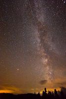 De heldere melkweg op de bloedmaroenhemel boven het bos, onze halctica.