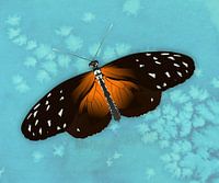 Een digitale vector illustratie van een heliconius hecale vlinder of passievlinder op een blauw groene aquarel achtergrond. De vlinder staat een beetje schuin in beeld. De vlinder komt voor in zuid Amerika.