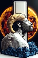 Dit kunstwerk, een fusie van mythologie en futurisme, toont een goddelijke figuur met gouden ramshorens die naar de oneindigheid staart. Omlijst door een kosmische zonsverduistering en een gladde monolithische poort symboliseert het beeld de balans tussen oude wijsheid en technologische vooruitgang. De poortwachter is uitgehouwen in een…