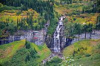 De Going-to-theSun weg in Glacier National Park is een geweldige weg om te rijden. De uitzichten zijn prachtig en zeer gevarieerd. We hielden van deze waterval in het herfstlandschap.