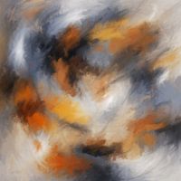 Wervelende patronen van verschillende tinten geel, oranje en blauw smelten samen en creëren een dynamische en energieke compositie. Brede, vegende penseelstreken dragen bij aan een abstract visueel effect, dat beweging en emotie oproept.