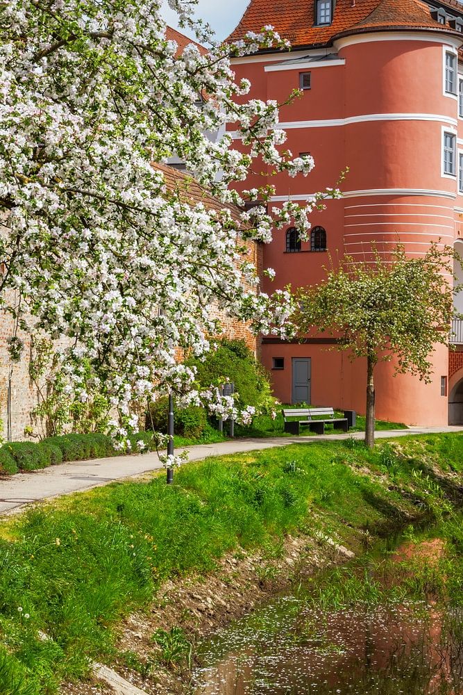 De historische Rieder Tor in Donauwörth aan de rivier de Wörnitz