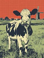 Een zwart-witte koe op de voorgrond met een grafisch rood raster en Hollandse huizen op de achtergrond. Stoer, modern en krachtig in vorm en kleur – ideaal als statement piece.