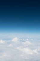 Het zicht op de wolken en de horizon vanuit een vliegtuig. De hemel kleurt in een gradatie van licht naar diep donker blauw alsof je naar de ruimte kan vliegen.