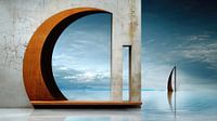 Deze foto legt een surrealistisch tafereel vast waarin geometrische vormen en natuurlijke elementen op een fascinerende manier harmoniëren. Op de voorgrond staat een massieve, halfronde boog van roestig metaal, die een fascinerend contrast vormt met het gladde wateroppervlak. De boog fungeert als een venster naar een andere dimensie, een uitnodiging om over te steken naar een stille en mystieke wereld.
