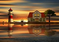 Een kleine vuurtoren en een huis met dieren in de romantische zonsondergang.
