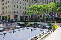 In de winter wordt de ijsbaan van Rockefeller Plaza in New York, VS, gebruikt om te schaatsen. In de zomer wordt de baan echter gebruikt voor rolschaatsen. Er zijn niet veel mensen actief op deze warme en droge dag in juli.
