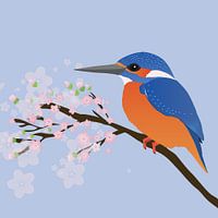 Een digitale illustratie van een ijsvogel. De ijsvogel zit relaxed op een tak met roze bloesem. De achtergrond is lichtblauw