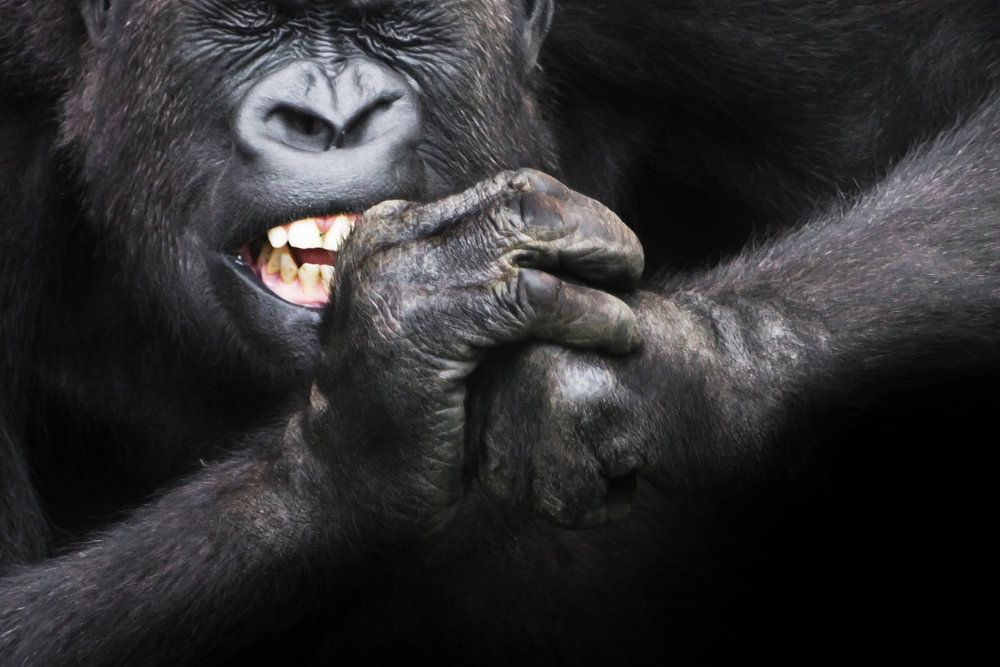 De ijver en het doorzettingsvermogen van een vrouwelijke gorilla die met ontbloot gebit en met dichtgeknepen ogen aan een hard voorwerp, voedsel, bovenlichaam, snuit en handen knaagt